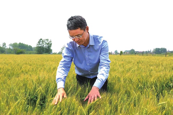 高德荣在麦田查看小麦生长情况。资料图片