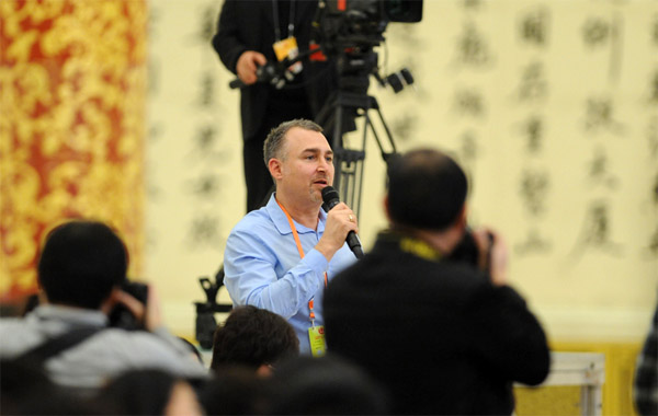 3月6日15:00时,全国政协十二届一次会议在人民大会堂三层金色大厅举行第一场记者会,邀请新一届民主党派中央和全国工商联九位主席集体接受媒体采访。图为纽约时报记者提问。新华网/中国政府网 陈竞超 摄