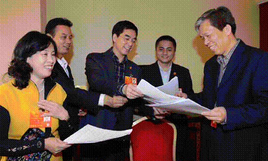 2013 年3 月全国人代会期间,广东团老代表李秉记与新代表叶国先、卢馨等交流履职心得,并一起提交议案、建议。摄影/ 王辉
