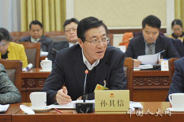 12月27日下午,十三届全国人大常委会第七次会议举行分组会议,审议国务院关于《中华人民共和国国民经济和社会发展第十三个五年规划纲要》实施中期评估报告,国务院关于2017年度中央预算执行和其他财政收支审计查出问题整改情况的报告。图为全国人大常委会委员孙其信在分组会上发言。中国人大网 陶宏林