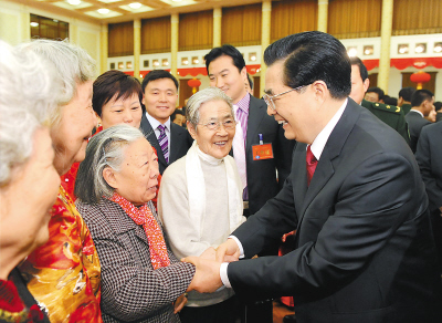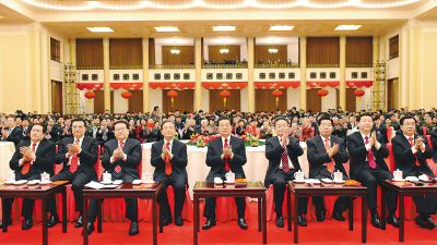 人民大会堂宴会厅张灯结彩、欢声笑语,一派喜庆景象。上午10时,在欢快的乐曲声中,胡锦涛等党和国家领导人步入会场,全场响起热烈的掌声。