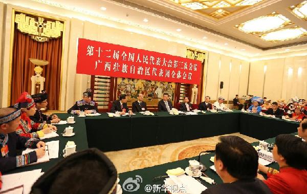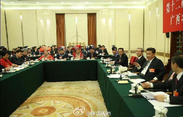 审议中,代表们还就完善国家扶持集中连片特困地区政策、加大中央转移支付力度、依靠特色产业扶贫等提出建议。“左右江老区涉及多少县?”“你们种植的核桃与北方核桃比有什么优势?”“农民搬迁后,原来的宅基地和承包地怎么处置?”“地方配套资金落实了吧?”习近平询问着一个一个具体问题,并把代表的意见和建议一一记下。总书记说,要看真贫、扶真贫、真扶贫,少搞一些盆景,多搞一些惠及广大贫困人口的实事。总书记希望广大干部群众勤劳实干、加快发展,并要求中央有关部门注重解决扶贫攻坚工作面临的突出问题。贫困地区各级领导干部要立下军令状,好干部要到扶贫攻坚一线经受磨练。
