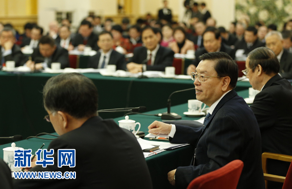 3月7日,中共中央政治局常委、全国人大常委会委员长张德江参加十二届全国人大四次会议安徽代表团的审议。新华社记者鞠鹏摄