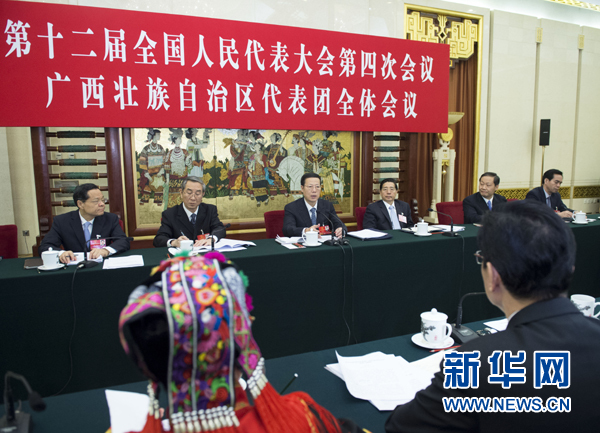 3月7日,中共中央政治局常委、国务院副总理张高丽参加十二届全国人大四次会议广西代表团的审议。 新华社记者王晔摄