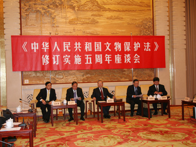 文化部副部长赵维绥、国务院法制办副主任汪永清、国家文物局局长单霁翔以及张文彬、谢辰生、鲍贤伦同志等先后在座谈会上发言。他们充分肯定了《文物保护法》修订实施的重要意义,认为《文物保护法》修订实施后,在进一步保护祖国文化遗产,弘扬中华民族文化传统方面发挥了重要作用,对我国文物事业的协调可持续发展产生了深远的影响,是我国文物事业在法制轨道上继续向前发展的里程碑,并就如何全面实施《文物保护法》,推动文物事业健康发展,提出了意见和建议。