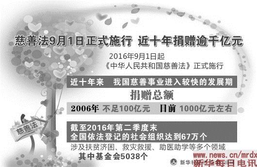 新华社北京8月31日电(记者王思北、施雨岑、吴晶)9月1日起,慈善法正式施行,慈善事业的健康发展将受到法律规范和保障。