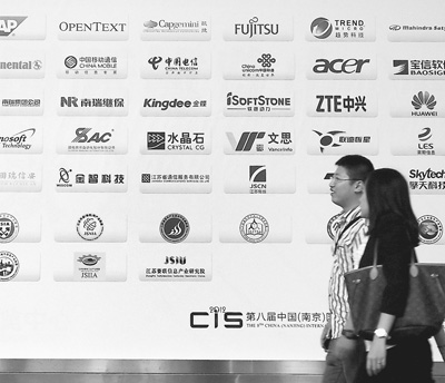 路人经过江苏南京软件产业的名企商标墙。王启明摄