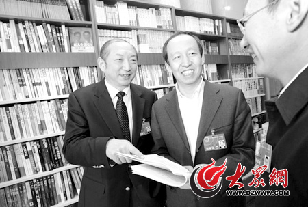 3月8日,出席十一届全国人大一次会议的山东代表程林、杜波、景新海(自右向左)就政府工作报告中提出的“加快构建覆盖全社会的公共文化服务体系,加强公益性文化事业建设,特别是加强社区和乡村文化设施建设”,展开热烈讨论。(记者 房贤刚)