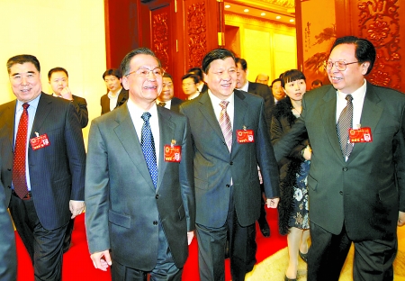 3月8日上午,中共中央政治局常委、国务院总理温家宝参加十一届全国人大一次会议河南代表团审议政府工作报告后,在中共中央政治局委员、书记处书记、中宣部部长刘云山,省委书记徐光春,省长李成玉陪同下步出会场。 河南日报记者 陈伟 摄