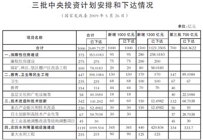 【背景】去年四季度以来,按照中央进一步扩大内需、促进经济平稳较快发展一揽子计划的工作部署,国务院已先后安排三批中央投资3000亿元,用于保障性住房、农村民生工程和农村基础设施、重大基础设施、卫生教育等社会事业、环境保护工程、自主创新和结构调整6方面建设。