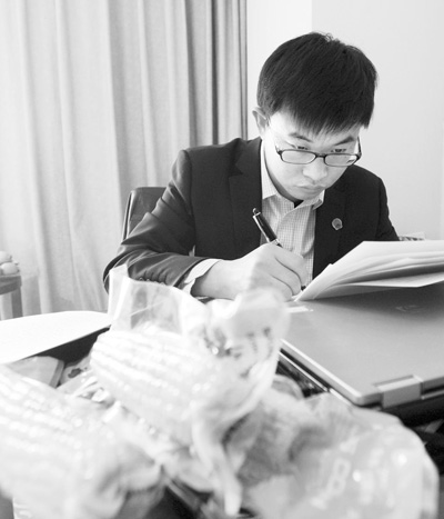 3月10日,全国人大代表马瑞强在房间为准备提交的议案签名,桌上摆着他带来的“水果玉米”。