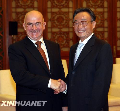 10月15日,全国人大常委会委员长吴邦国在北京人民大会堂会见瑞士联邦议会国民院议长安德烈·比尼翁。新华社记者刘卫兵摄