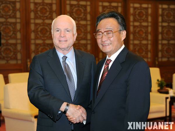 新华网北京4月8日电(记者熊争艳)全国人大常委会委员长吴邦国8日在人民大会堂会见美国国会参议院军事委员会首席成员麦凯恩一行。