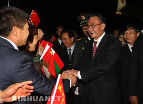 当地时间11月10日晚,中国全国人大常委会委员长吴邦国抵达塔那那利佛,开始对马达加斯加进行正式友好访问。马达加斯加国民议会议长西拉(前右一)到机场迎接。新华社记者刘卫兵摄