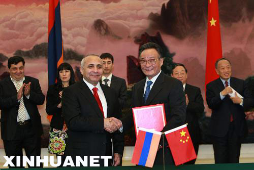 12月15日,全国人大常委会委员长吴邦国在北京人民大会堂会见亚美尼亚国民会议主席阿布拉米扬。这是会见结束后,吴邦国和阿布拉米扬共同签署《中华人民共和国全国人民代表大会和亚美尼亚共和国国民会议交流与合作谅解备忘录》。新华社记者庞兴雷摄
