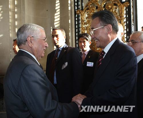 11月5日,正在阿尔及利亚进行正式友好访问的全国人大常委会委员长吴邦国在阿尔及尔会见阿尔及利亚民族院议长本·萨拉赫。新华社记者刘卫兵摄