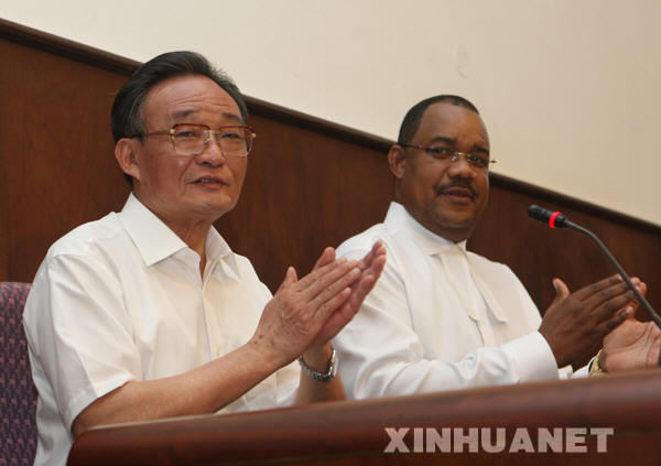 11月13日,中国全国人大常委会委员长吴邦国前往塞舌尔国民议会访问并致辞。右为塞舌尔国民议会议长赫米尼耶。新华社记者刘卫兵摄