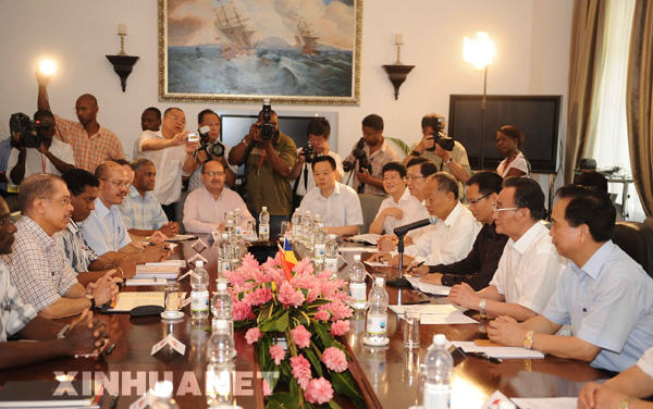 11月13日,正在塞舌尔进行正式友好访问的中国全国人大常委会委员长吴邦国在维多利亚会见塞舌尔总统米歇尔。新华社记者高洁摄