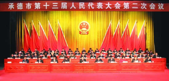 2月10日,市十三届人大二次会议在承德大剧院隆重开幕。图为大会会场。