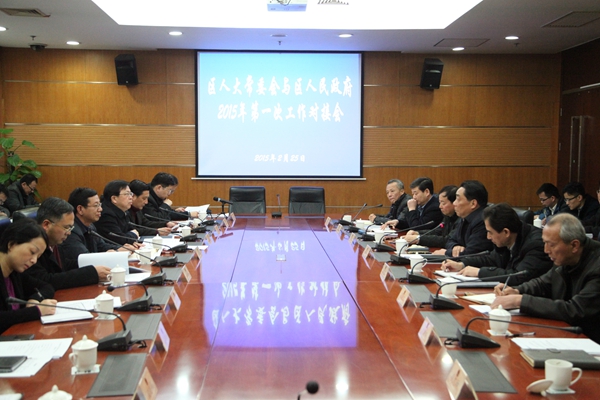 2月25日下午,区人大常委会与区人民政府2015年第一次工作对接会在区会议中心举行。区人大常委会主任杜治中,副主任刘跃俊、殷金荣、张俊宏、朱喜林、袁晓英;区人民政府区长胡卫国,副区长沈华棣、沈山州、许复新、陆瑾、吴杰、吴瑞弟出席会议。区人大常委会主任杜治中主持会议。
