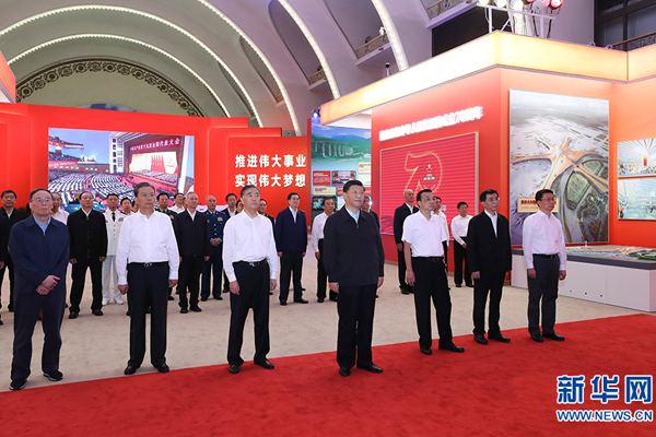 下午4时10分许,习近平等党和国家领导同志来到北京展览馆,步入展厅参观展览。展览以开辟和发展中国特色社会主义道路、建设社会主义现代化国家为主题,以编年体为时间主线,安排设计了5个部分,并体现历次党代会和重要中央全会、五年规划(计划)等方面的跨段主线,选择150个“新中国第一”进行展示,每10年设置英雄模范人物墙,充分运用声光电等多媒体科技展示手段,全方位立体化呈现新中国成立70年来中国共产党领导中国人民发愤图强、艰苦奋斗实现的伟大跨越,清晰展现党的领导和我国社会主义制度集中力量办大事的政治优势,深刻揭示新中国70年巨变背后的深刻道理。