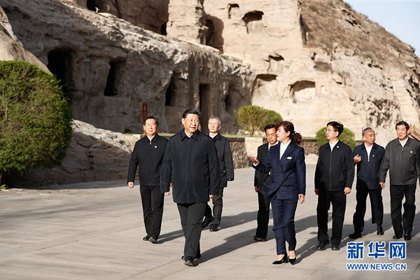 傍晚时分,习近平来到云冈石窟考察。云冈石窟始建于1500多年前,是中外文化、中国少数民族文化和中原文化、佛教艺术与石刻艺术相融合的一座文化艺术宝库。习近平仔细察看雕塑、壁画,不时向工作人员询问石窟历史文化遗产保护等情况。他强调,云冈石窟是世界文化遗产,保护好云冈石窟,不仅具有中国意义,而且具有世界意义。历史文化遗产是不可再生、不可替代的宝贵资源,要始终把保护放在第一位。发展旅游要以保护为前提,不能过度商业化,让旅游成为人们感悟中华文化、增强文化自信的过程。要深入挖掘云冈石窟蕴含的各民族交往交流交融的历史内涵,增强中华民族共同体意识。游客们看到总书记,纷纷高呼:“总书记好!”习近平向大家挥手致意,并叮嘱景区工作人员在常态化疫情防控下要加强引导、控制人流,避免因大规模人员聚集引发疫情复燃。