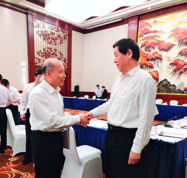 2019年6月6日上午,栗战书委员长在江苏省苏州市主持召开长江保护法立法座谈会。图为栗战书与周萌代表握手交流。摄影/周秀钢