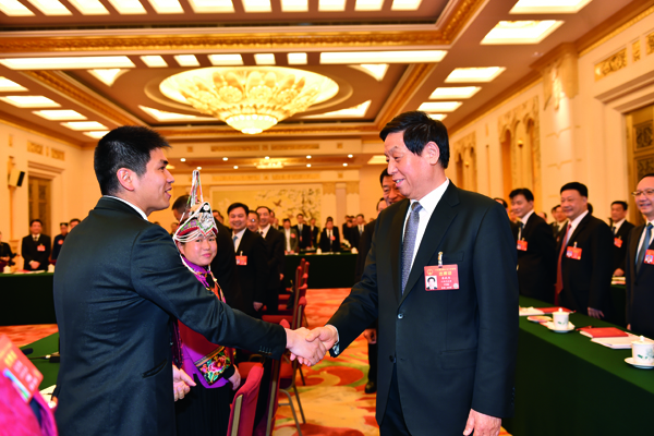 2019年3月,栗战书委员长来到江西代表团,同代表们一起审议大会议题。图为栗战书与李洪亮代表握手交流。摄影/《中国人大》全媒体记者 马增科