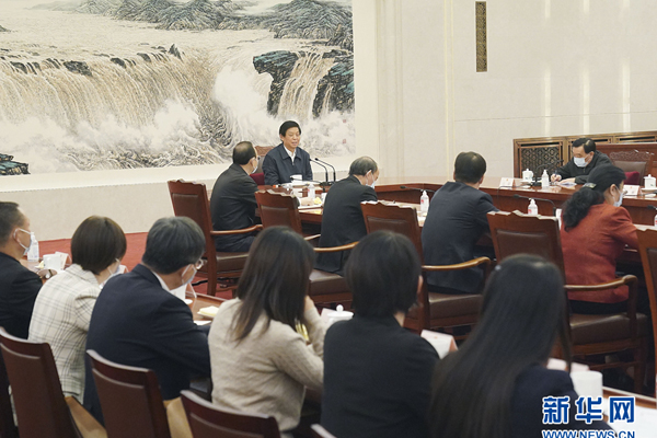 10月14日,中共中央政治局常委、全国人大常委会委员长栗战书在北京与列席十三届全国人大常委会第二十二次会议的全国人大代表座谈交流。新华社记者 刘卫兵 摄