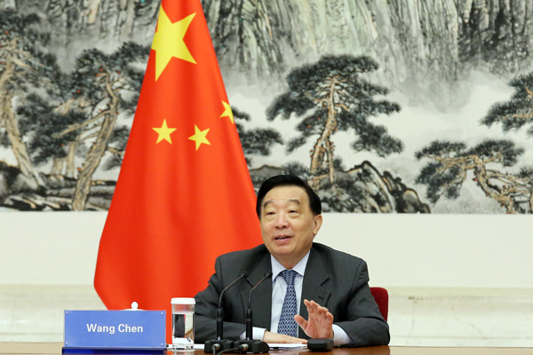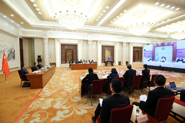 10月15日,中共中央政治局委员、全国人大常委会副委员长王晨在京同哈萨克斯坦议会下院副议长伊希姆巴耶娃举行视频会晤。许麟 摄