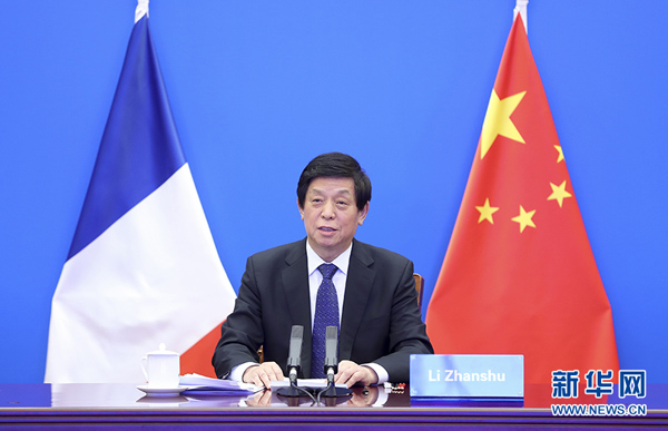 栗战书强调,中国全国人大愿同法国国民议会一道,以习近平主席和马克龙总统的战略共识为引领,坚定维护中法政治互信,加强各层级对话,深化在经贸、投资、金融、环境、卫生、社保等经济社会民生领域的立法交流。今天举行的视频会议就是迅速落实两国领导人共识的一个具体行动。充分发挥立法机构的职能作用和优势,推动两国发展战略对接,努力为落实双边协议和大项目合作提供法律保障,为两国友好合作搭建广阔平台。丰富和拓展友好小组之间的交往合作,推动科技、教育、文化、卫生、青年、妇女等专门领域人大代表和议员的对话交流,讲好“中法友谊故事”。加强沟通协调,共同维护以联合国为核心的国际体系、以国际法为基础的国际秩序、以世界贸易组织规则为基石的多边贸易体制。