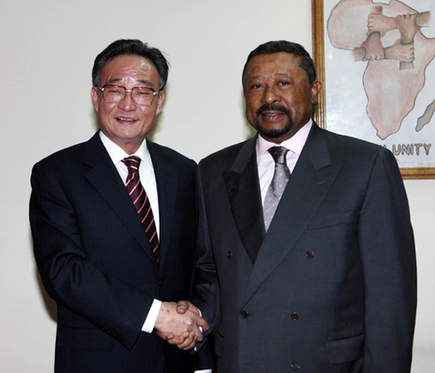 十一月十日,正在埃塞俄比亚进行正式友好访问的全国人大常委会委员长吴邦国在位于亚的斯亚贝巴的非盟总部会见非盟委员会主席让·平。新华社记者 刘卫兵摄