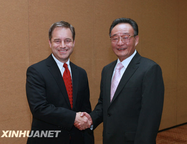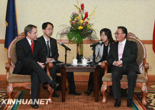 9月12日,正在美国进行正式友好访问的全国人大常委会委员长吴邦国在安克雷奇市会见阿拉斯加州州长帕内尔。新华社记者庞兴雷摄