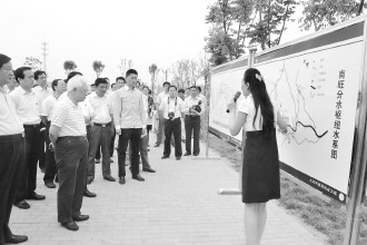 图为全国人大常委会执法检查组听取南旺分水枢纽工程考古遗址公园讲解。