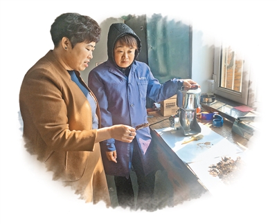 高桂英(左)了解养鹿户鹿产品加工情况。资料图片