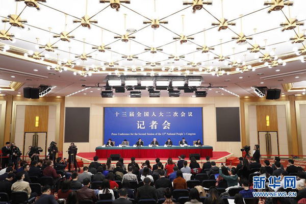 3月11日,十三届全国人大二次会议新闻中心举行记者会,邀请科技部部长王志刚、副部长李萌、战略规划司司长许倞、政策法规与创新体系建设司司长贺德方、资源配置与管理司司长张晓原就“加快建设创新型国家”相关问题回答中外记者提问。 新华社记者 沈伯韩 摄