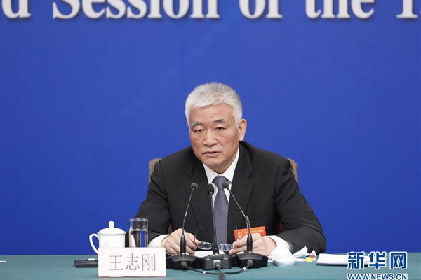 3月11日,十三届全国人大二次会议新闻中心举行记者会,邀请科技部部长王志刚、副部长李萌、战略规划司司长许倞、政策法规与创新体系建设司司长贺德方、资源配置与管理司司长张晓原就“加快建设创新型国家”相关问题回答中外记者提问。这是王志刚在回答记者提问。 新华社记者 沈伯韩 摄