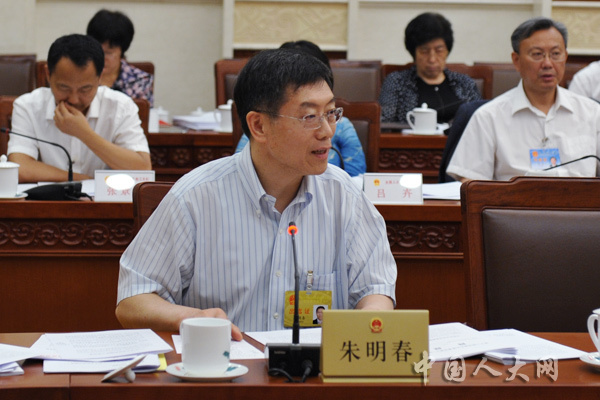 6月27日上午,十三届全国人大常委会第十一次会议举行分组会议,审议国务院关于2018年中央决算的报告,国务院关于2018年度中央预算执行和其他财政收支的审计工作报告,全国人大财政经济委员会关于2018年中央决算草案审查结果的报告。图为全国人大常委会委员朱明春在分组会上发言。中国人大网 冯涛 摄