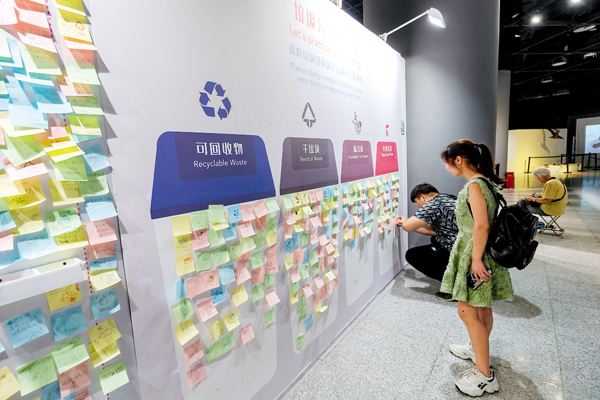 7月16日,上海市垃圾分类正式实施的第16天,在上海科技馆内,一面垃圾分类印章墙颇引人注目,游客在一旁的留言区贴满了留言小纸条。图/中新社发 王冈 摄