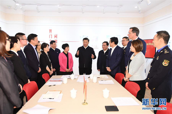 临近傍晚,习近平来到长宁区虹桥街道古北市民中心考察调研。古北社区居住着来自50多个国家和地区的居民。习近平听取社区开通社情民意直通车、服务基层群众参与立法工作等情况介绍,并同正在参加立法意见征询的社区居民代表亲切交流。他强调,你们这里是全国人大常委会建立的基层立法联系点,你们立足社区实际,认真扎实开展工作,做了很多接地气、聚民智的有益探索。人民代表大会制度是我国的根本政治制度,要坚持好、巩固好、发展好,畅通民意反映渠道,丰富民主形式。