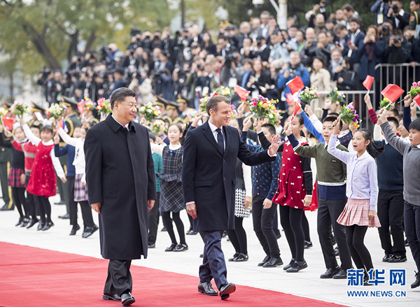 11月6日,国家主席习近平在北京人民大会堂同法国总统马克龙会谈。这是会谈前,习近平在人民大会堂东门外广场为马克龙举行欢迎仪式。新华社记者燕雁摄