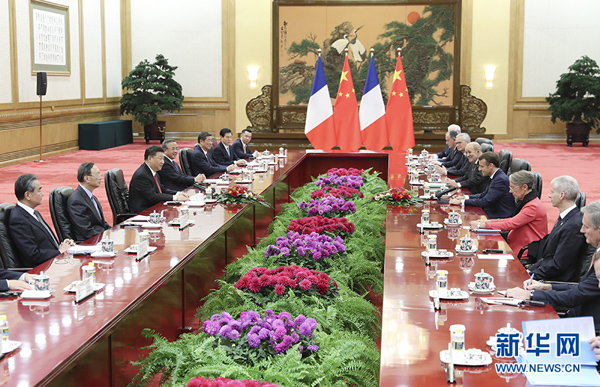 马克龙表示,很高兴在法中建交55周年之际再次访华,我同习近平主席频繁交往,深化了法中友谊和政治互信,有力推动了务实合作。我完全赞同习近平主席对深化法中合作提出的看法。法中在许多重大国际问题上持有相同立场,在当前国际形势下,法中作为两个大国,负有特别重要的责任,法国加强同中国的对话和合作,具有重要示范作用。对双方之间的一些分歧,法方愿本着相互尊重的精神妥善处理。法国企业热切期待抓住中国扩大对外开放的契机,进一步进入中国市场,扩大对华农产品出口,加强在航空、航天、民用核能等传统领域合作,拓展科技创新、金融等领域合作。中方在法国发行欧元债券,这对法国具有重大意义。法方对中国企业赴法合作持开放态度,不会针对中国企业关上市场大门。法方愿推动“一带一路”同欧盟欧亚互联互通战略对接,共建绿色“一带一路”。法中要扩大人文交流,促进文明互鉴。法中要共同维护多边主义,在反恐、伊朗核等问题上加强战略沟通协调,推动世贸组织改革早日取得进展。法中将共同发表《法中生物多样性保护和气候变化北京倡议》,两国可以在这些重要问题上发挥引领作用。在当前充满不确定性的世界里,欧盟深化对华合作至关重要,法方愿推动欧中关系深入发展,加快欧中投资协定谈判进程。