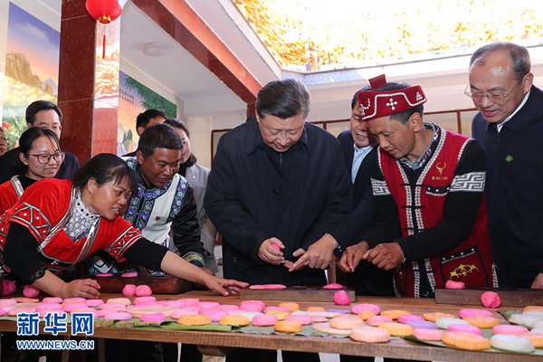 1月19日至21日,中共中央总书记、国家主席、中央军委主席习近平来到云南,看望慰问各族干部群众,向全国人民致以新春祝福。这是19日下午,习近平在腾冲市清水乡三家村中寨司莫拉佤族村,同村民李发顺一家制作当地节日传统食品大米粑粑。新华社记者 鞠鹏 摄