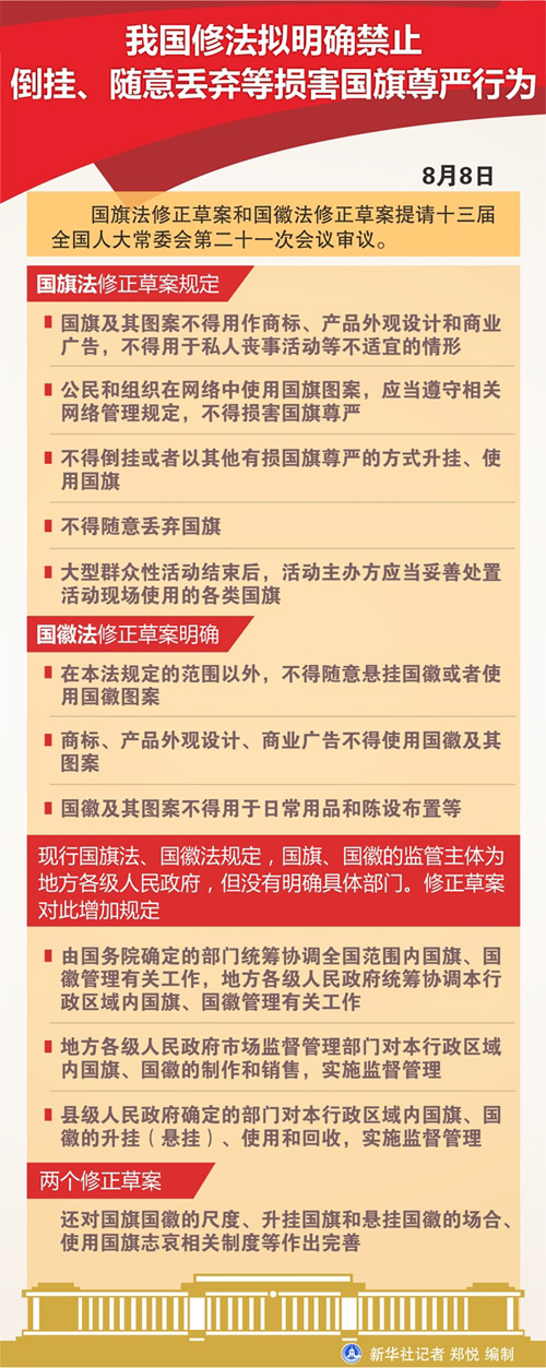 新华社北京8月8日电 题:如何加强维护国旗、国徽的尊严?——聚焦国旗法国徽法修正草案五大看点
