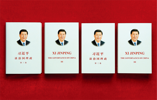 中央宣传部(国务院新闻办公室)会同中央党史和文献研究院、中国外文局编辑的《习近平谈治国理政》第三卷,近日由外文出版社以中英文版出版,面向海内外发行。图为《习近平谈治国理政》第三卷中英文版的精装版和平装版。新华社记者 李贺/摄