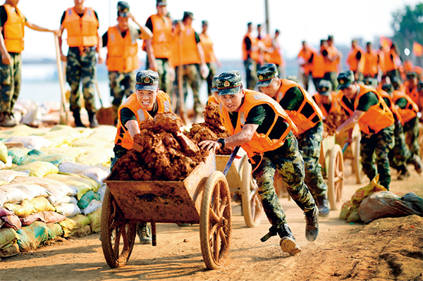 2020年7月以来,我国多地遭遇持续强降雨,发生严重洪涝灾害。人民至上、生命至上。提前转移、紧急营救、妥善安置……一场涉及上百万群众生命的生死竞速就此拉开。图为2020年7月17日,武警江西总队机动支队党员突击队在江西省鄱阳县鄱阳镇昌江圩用推车将余土推到空地堆放。新华社发 曹先训/摄