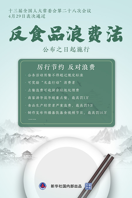 新华社北京4月29日电(记者任沁沁、罗沙)历经二次审议,十三届全国人大常委会第二十八次会议29日表决通过了反食品浪费法,自公布之日起施行。这意味着,从29日起,厉行节约、反对浪费不再仅仅是倡导和号召,已经成为生效的法律条文。