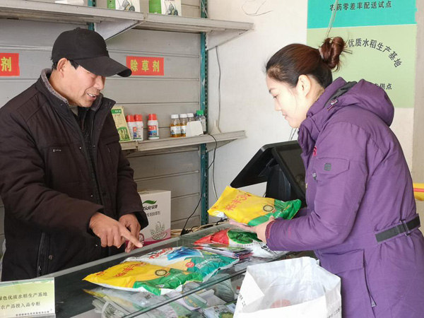 权太琦(右)在农资销售店询问价格变化。新华社记者 陆华东 摄