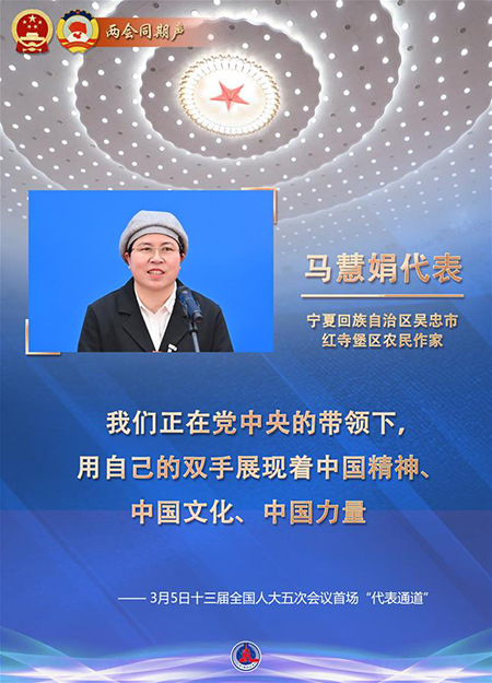 来自宁夏回族自治区吴忠市红寺堡区的农民作家马慧娟代表,正是受益于移民搬迁政策,才有机会走出大山,写作出书、加入中国作家协会,从黄土地来到人民大会堂。