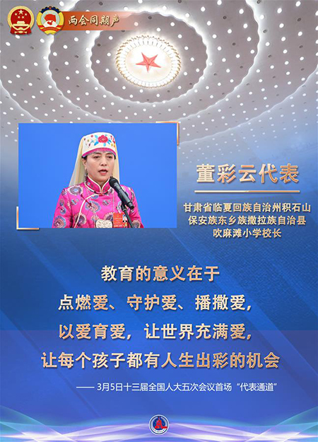 “没有爱就没有教育。”甘肃省临夏回族自治州积石山保安族东乡族撒拉族自治县吹麻滩小学校长董彩云代表动情讲述了自己曾帮助一位听力残疾学生长大成人的故事,董彩云也因此成为这名学生的“校长妈妈”。如今,这名学生不仅可以自食其力,还能服务社会。